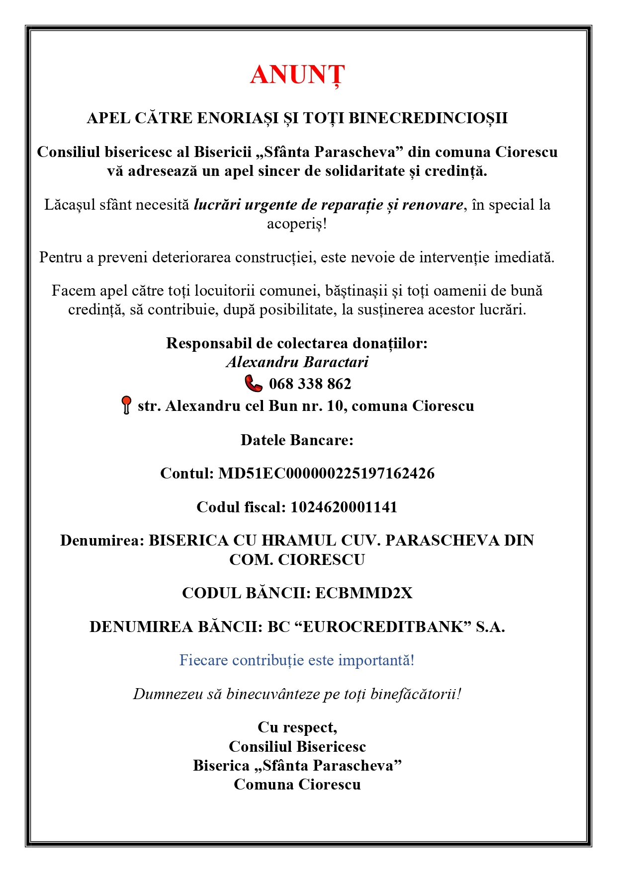 Adresa juridică a bisericii: com. Ciorescu, mun. Chişinău, str. Alexandru Cel Bun 9, tel.:(37322)45-66-42;